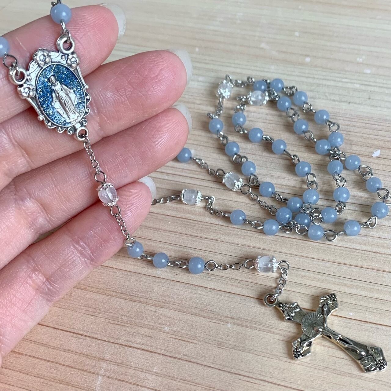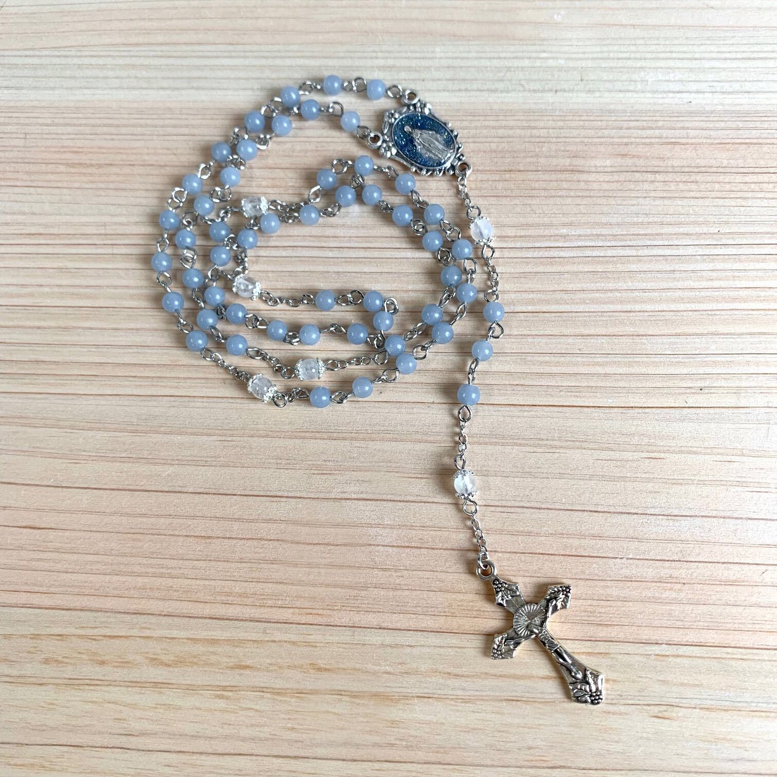 「アヴェマリアの祈り」部分に使用しております『エンジェライト』は、ギリシヤ語で「天使」を意味する「angelos」に由来しており、ロザリオにぴったりの天然石です。深みのある優しい青色で、落ち着いた雰囲気のロザリオに仕上がっております。
