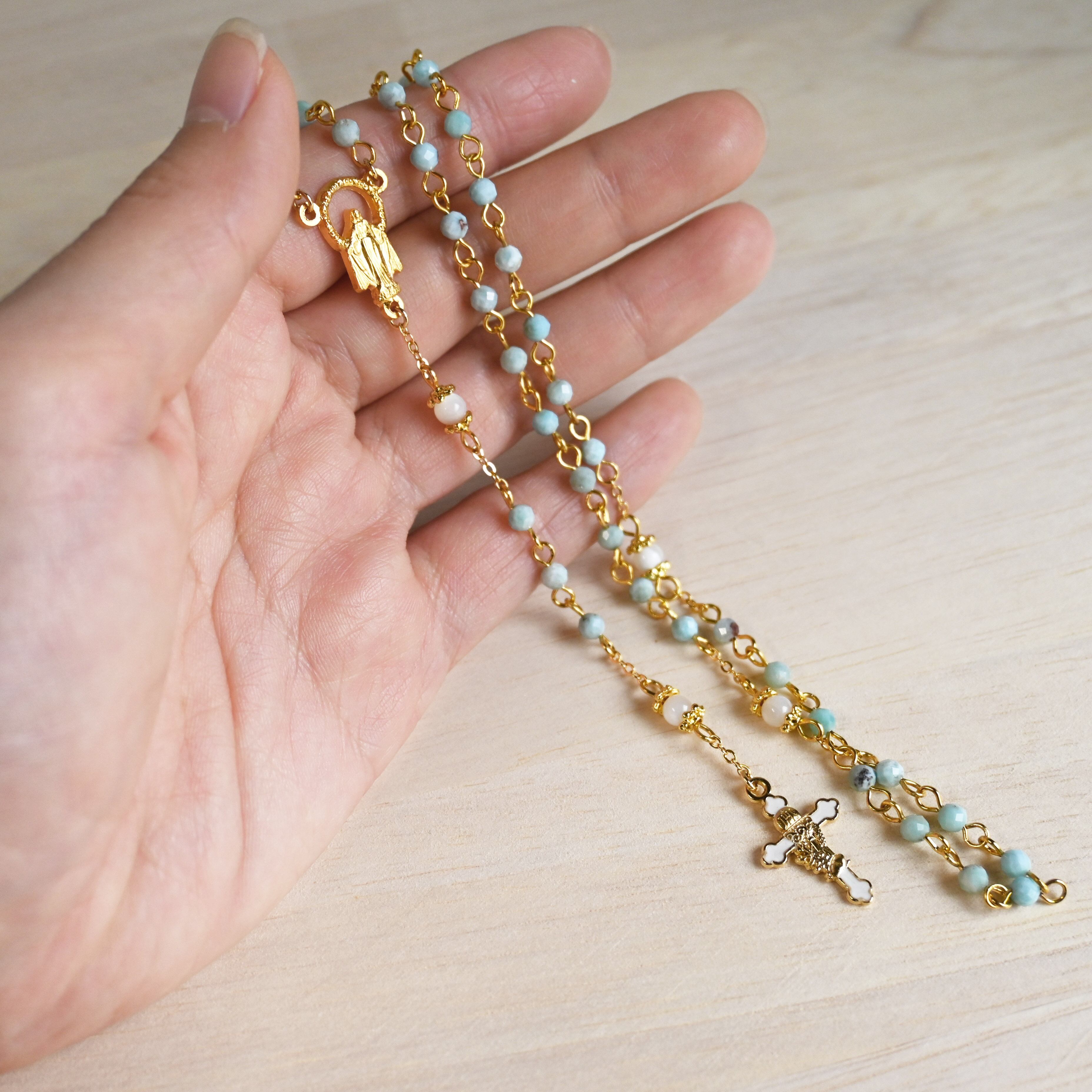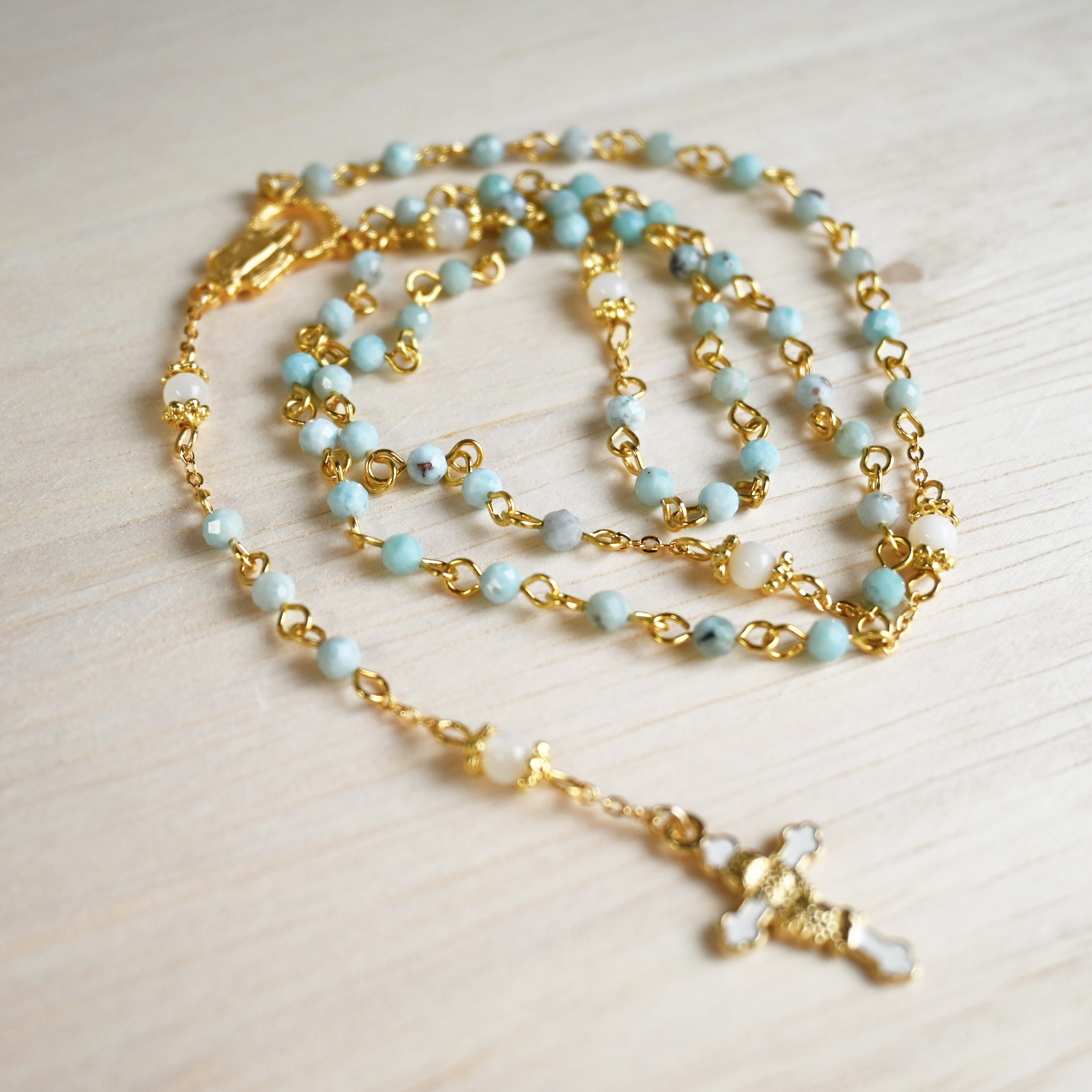 天然石の『ラリマー』と『マザーオブパール』を使用した5連ロザリオです。